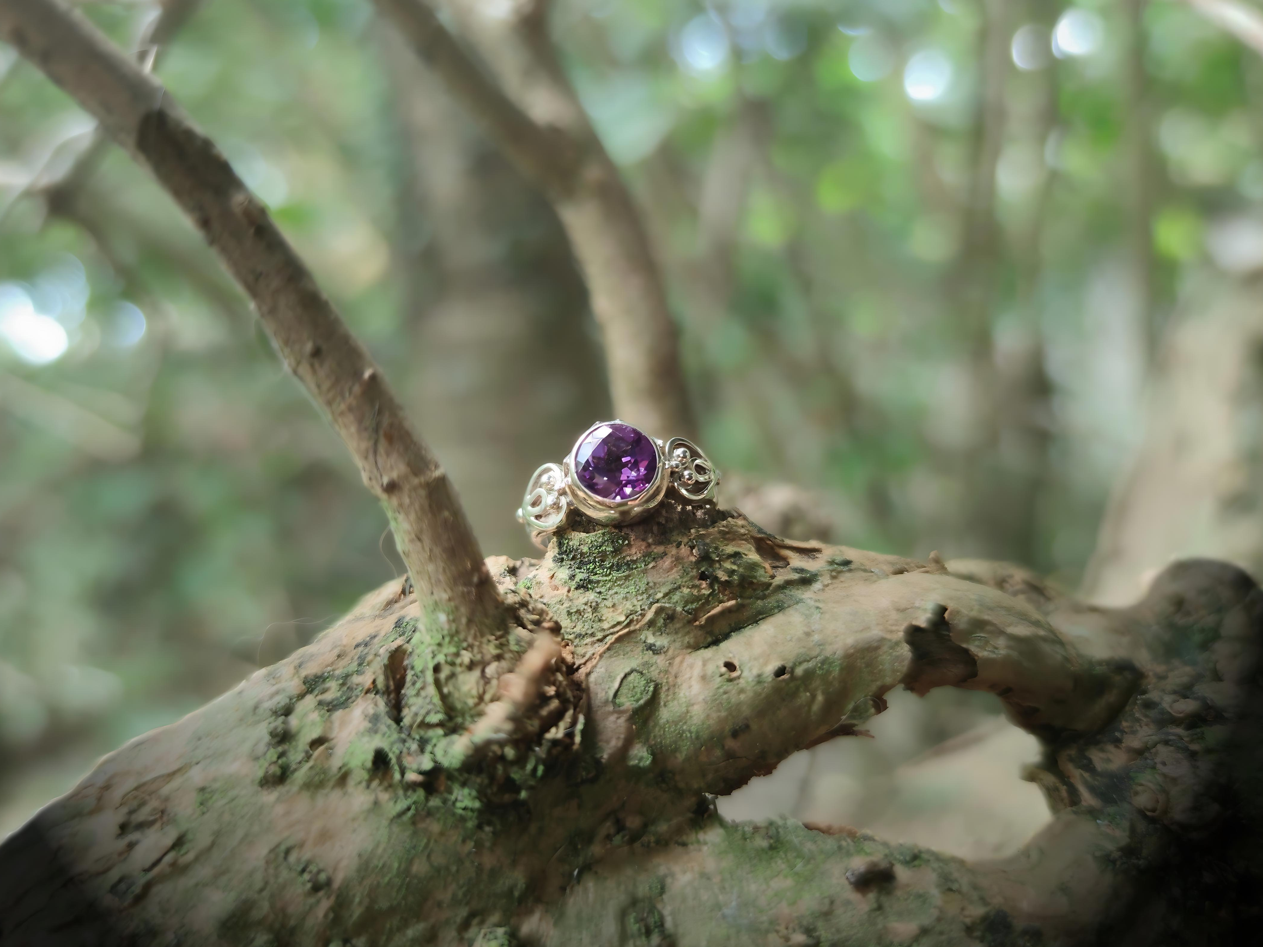 A beautiful piece in its simplicity. A stunningly clear purple amethyst is presented in the classic brilliant cut and allowed to really shine. Set into a clean silver ring with subtle detailing this ring can match with almost anything and provides incredible understated elegance.