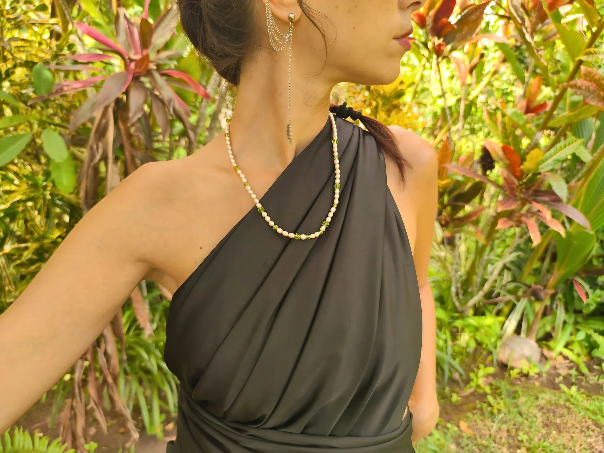 Pink pearls bring a whimsical elegance to any outfit. That combined with the subdued, elegant forest green of the accent beads in this light, fine necklace make for a summertime classic.